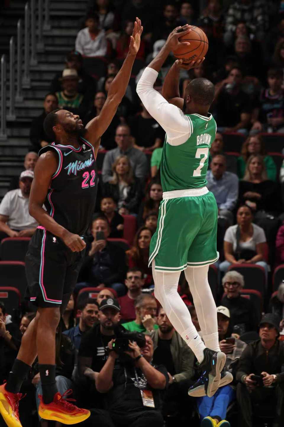 中场休息回来,双方第三节依然是均单节不足30分,凯尔特人核心布朗迎来爆发表现,布朗第三节10中4与不断罚球得到15分。只是热火第三节开局维持72-60领先,并在之后持续维持两位数领先优势,热火之后扩大90-76领先优势。凯尔特人略有反扑追分,双方单节维持29-29,三节结束热火93-83领先凯尔特人。前三节比赛双方均4人得分上双,凯尔特人三分29中9,布朗22分与西蒙斯21分,热火三分32中12,希罗与鲍威尔均20分、阿德巴约19分。